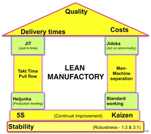 een tijdlijn met diverse markante punten in het kader van de lean-filosofie; quality, delivery times, costs, just in time (jit), takt time, pull flow, heijunka (production leveling), jidoka (act on abnormality), man-machine separation, standard working, continuous improvement with 5s and kaizen, stability and robustness; klik voor groter (lean enterprise institute)![]() |