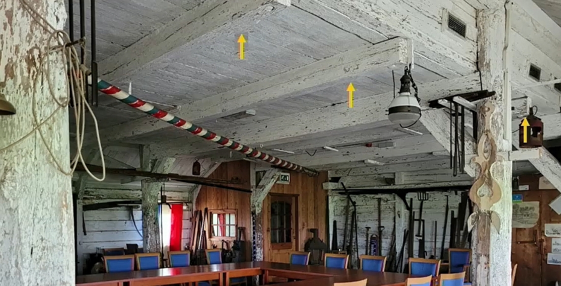 leugenbalken bevestigd aan een hoofdbalk van een houten skelet; de locaties zijn aangegeven door de gele pijlen; klik voor groter! (foto kim heuvelmans, bouwhistoricus, boei): ![]() |
