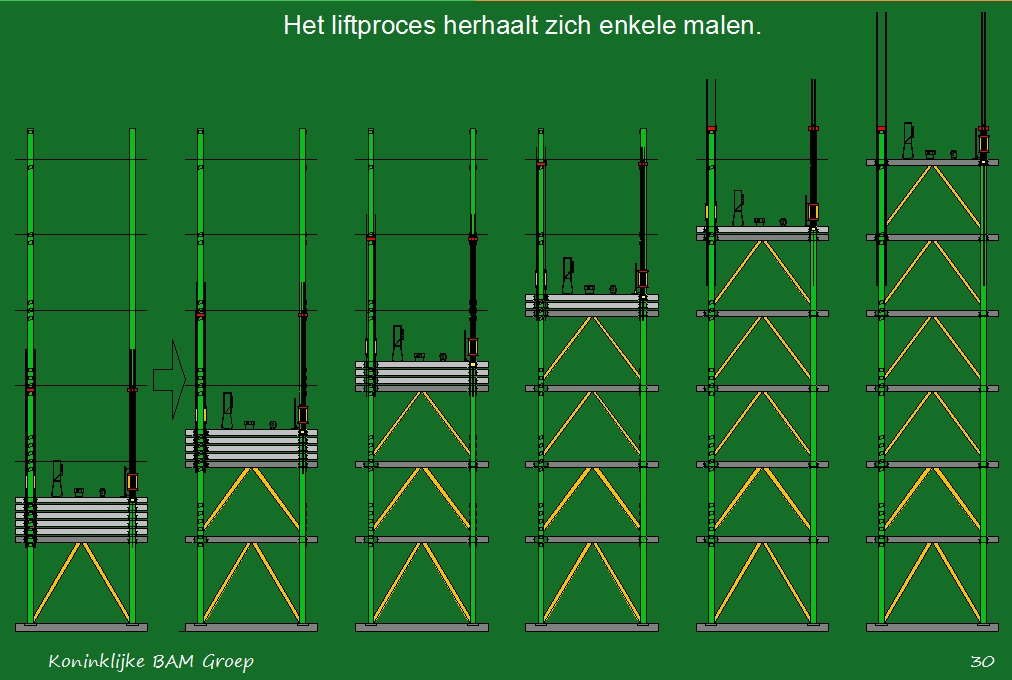 - als eerste wordt de dakvloer omhoog gevijzeld of getrokken (tot ca. 1,5 m boven de locatie van de vloer van de 1e verdieping; dus niet geheel tot de uiteindelijke plaats van de dakvloer, omdat de kolommen dan zouden knikken)