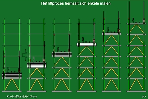 - en vervolgens herhaalt zich het proces van optrekken of vijzelen naar ca. 1,5 m boven de verdiepingvloer (van dakvloer tot 2e verdiepingvloer enz. enz.).
