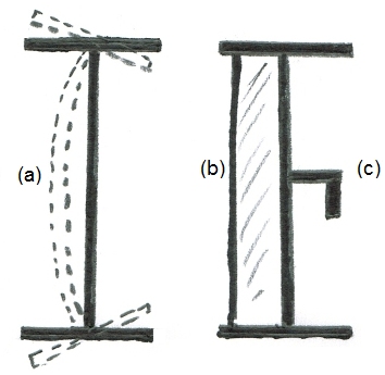 onderstaand het nut van verstijving van een H- of I-profiel tot een verstijvingsligger; verstijving van de ligger heeft tot doel de ligger en daarmee de constructie waarvan de ligger een onderdeel is, meer stijfheid te geven; tekening van een mogelijke buiging van een ligger (hier een i-profiel) en de mogelijkheden tot verticale en horizontale verstijving; - bij (a) een mogelijke verbuiging onder invloed van een belasting - bij (b) een verticale verstijving (een plaat staal tussen bovenflens en onderflens, loodrecht op het lijf van de ligger) - bij (c) een horizontale verstijving (een L-vormige plaat staal gelast op het lijf van de ligger) ![]() |