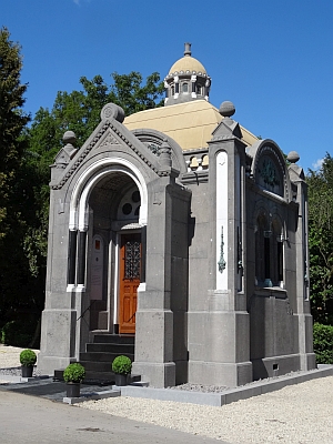 mausoleum voor en door de familie pieter kruijff bartholomeus & zn., gebouwd in 1911 in neoromaanse stijl, centraalbouw; begraafplaats oud kralingen in rotterdam; fors en fraai gerestaureerd in 2014/2015 door norman langelaan restauratie-architect en bambam steenhouwers; het columbarium in de grafkelder is op een hedendaagse manier vormgegeven (zie bij columbarium); klik voor groter: ![]() |