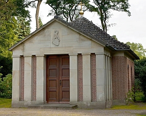 mausoleum van keizer wilhelm ii, park doorn bij huis doorn, gebouwd in 1941/1942; hier is toch een verwijzing naar religie aanwezig (wereldbol met kruis, als piron);afbeelding museum huis doorn; klik voor groter: ![]() |