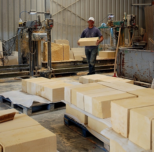 fijnkorrelige geelwitte kalksteen, die geschikt is voor de bouw en toegepast