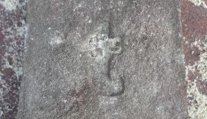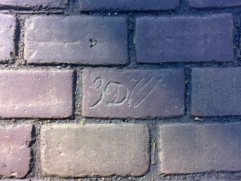 teken t, waarschijnlijk via de mal verdiept in baksteen; de letter t lijkt verhoogd te liggen maar het is toch echt verdiept, verg. de speculaasplank voor dit soort visuele rariteiten; klik voor de afbeelding die het omgekeerd toont en nu ligt de letter t wél verlaagd (foto joostdevree): ![]() |
