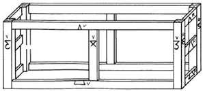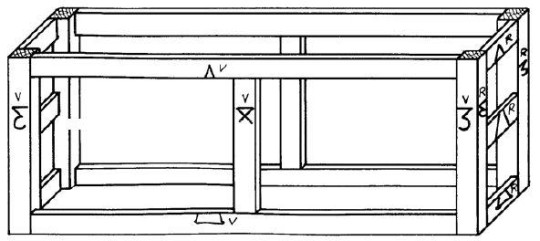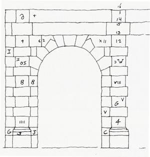 assemblagemerken of telmerken op natuursteenleveranties zodat op de bouwplaats de volgorde van de te stapelen stenen duidelijk was; hier cijfers van onder naar boven en letters van links naar rechts (inleiding in de bouwhistorie van ronald stenvert en gabri van tussenbroek, uitgeverij matrijs): ![]() |