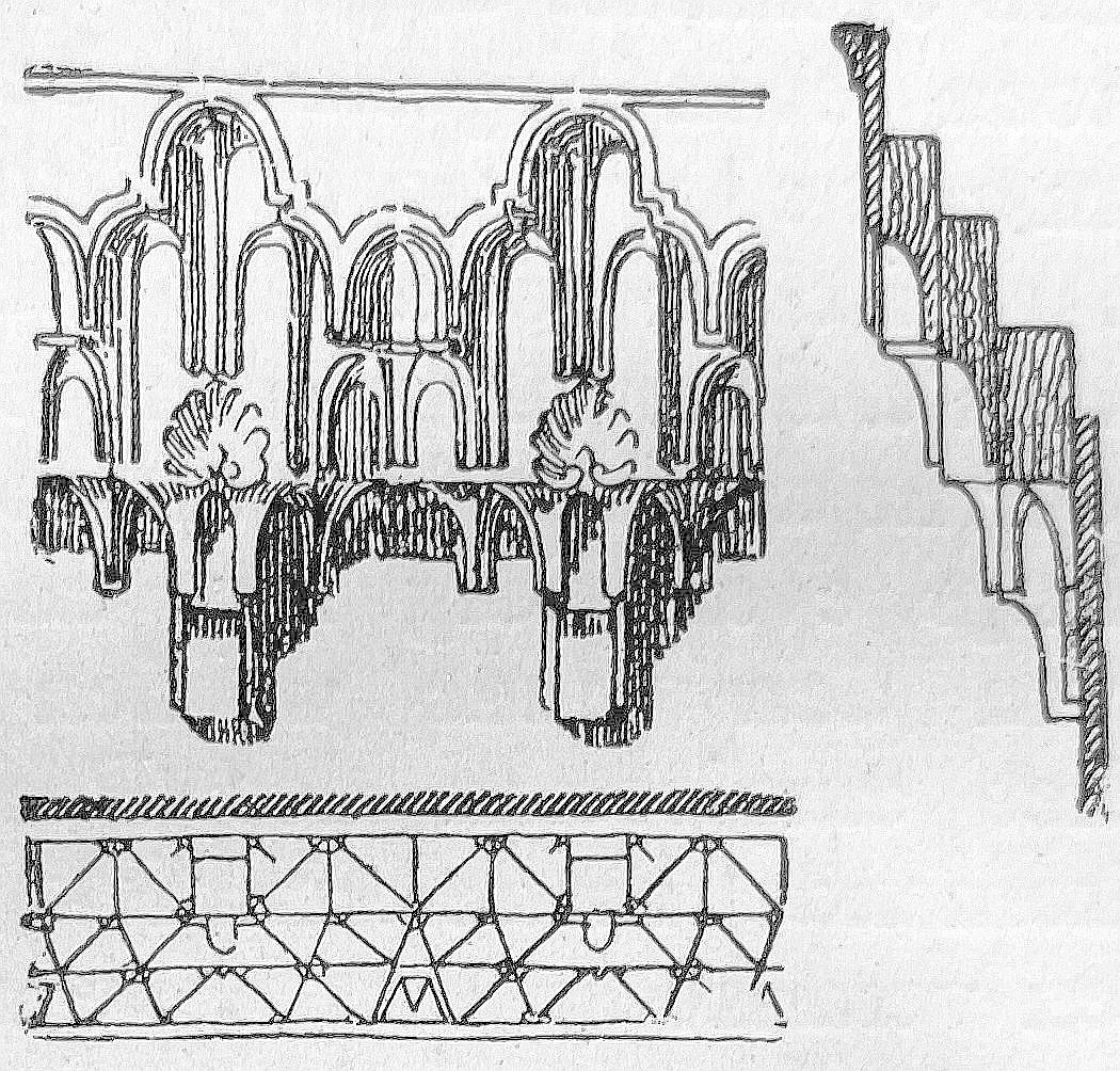 muqarna van het alhambra en (onderaan de afbeelding) de mogelijke oorsprong vanuit driehoeken (k.o. hartmann, de ontwikkeling der bouwkunst, eerste deel, 1923): ![]() |