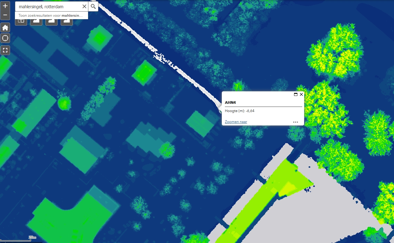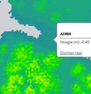 - Bepaal de hoogte in m NAP per postcode (AHN): de hoogte in NAP wordt getoond; let op: de hoogten van objecten worden nogal onhandig weergegeven.