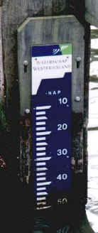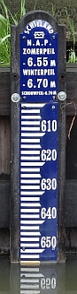 West-Nederland ligt grotendeels onder NAP. De linker foto hieronder, uit Rotterdam Hillegersberg, geeft dit aan: het winterpeil is 6,70 onder NAP. Dit is overigens niet het laagste punt van Nederland en bedenk dat dit de hoogte van de grondwaterstand is, niet die van het maaiveld. (Klik op de linkerfoto voor de omgeving en de NAP-stand in het Actueel Hoogtebestand Nederland.)