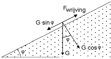 "Een gronddeeltje heeft een eigen gewicht G en ligt aan de oppervlakte van het talud. Het glijdt net niet naar beneden omdat er voldoende wrijving is tussen dit deeltje en de overige deeltjes.
