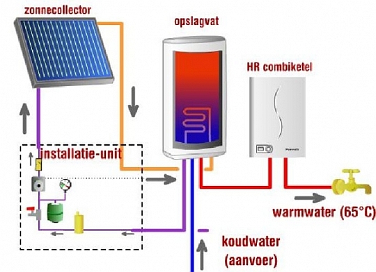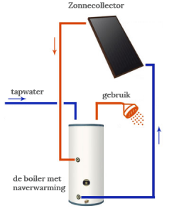 schema van een zonneboiler met interne naverwarmer (huisfocus.nl): ![]() |