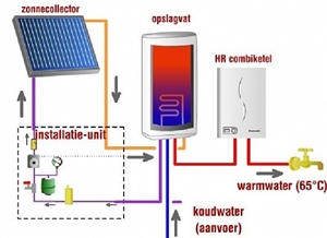 schema van een zonneboiler met een combiketel met nz-label als naverwarmer; klik voor groter (jacotech): ![]() |