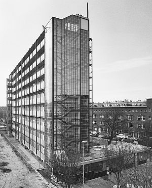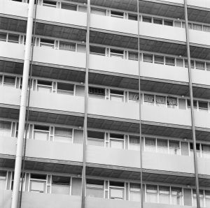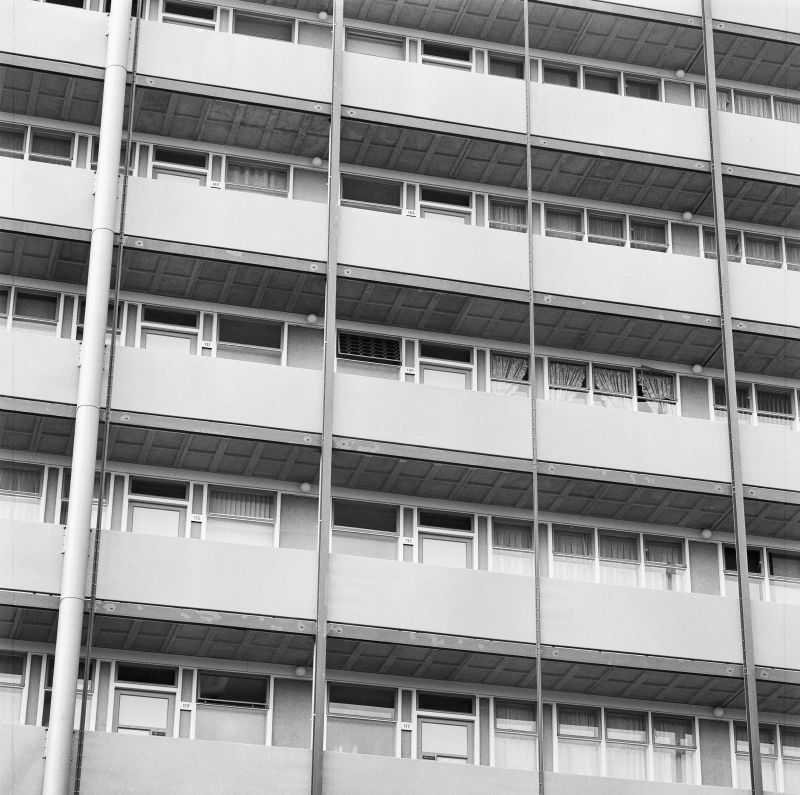 ook dit is nieuwe zakelijkheid; hoogbouw bergpolderflat, rotterdam, de eerste galerijflat van nederland; staalskelet met houten vloeren en om de drie woonlagen een brandvrije betonvloer; arch. w. van tijen i.s.m. brinkman & van der vlugt (foto g.j. dukker, 1994, beeldbank cultureel erfgoed documenten 305704 en 305699): ![]() |