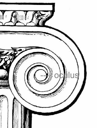 3. De oculus is het middelpunt of trekpunt van een voluut: het "oog" van waaruit zich de spiraalvormige voluut vormt ("trekt").