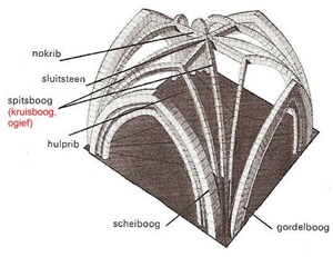een voorbeeld van een ogief als spitsboog bij een kruisribgewelf; klik voor groter (grote nederlandse larousse encyclopedie): ![]() |
