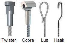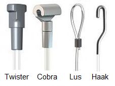 Let op: vaak worden de onderdelen van het systeem van dezelfde leverancier betrokken; onderlinge uitwisseling is niet zeker; uitwisseling is vrijwel niet mogelijk wanneer de diktes van koord/kabel verschillen. Informeer hierover bij bijvoorbeeld Alle ophangsystemen.