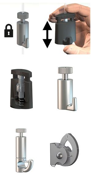 - kan meestal over het koord omhoog en omlaag geschoven worden om de juiste positie van het schilderij te verkrijgen ("met één handbeweging hangt u wanddecoraties op de juiste hoogte")