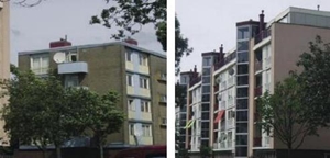 Meer woningen, bestaande woningen gerenoveerd, en betere uitstraling (situatie oud en nieuw): ![]() |