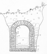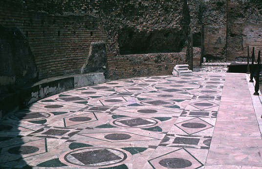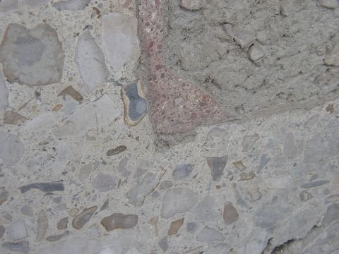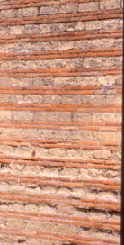 opus signinum (ook: cocciopesto (coccio=scherf; pestare=pletten, stampen, malen) mortel van kalk en tegelgruis): |