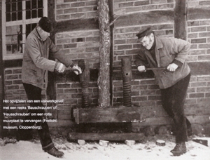 vroeger werd opgevijzeld met houten materiaal (ook de schroefdraad van de vijzel is van hout): het opvijzelen van een vakwerkgevel met een reeks "bauschrauben" of "hausschrauben" om een rotte funderingsbalk te vervangen (museumdord cloppenburg, uit de gildebrief van ambacht&gereedschap): ![]() |