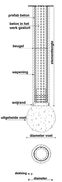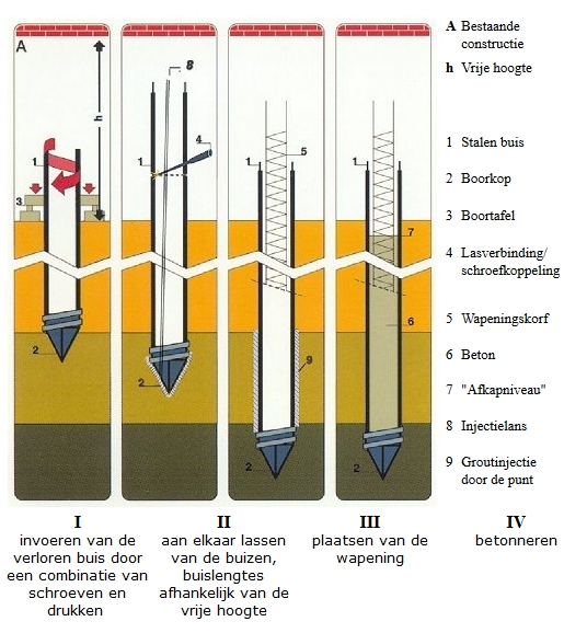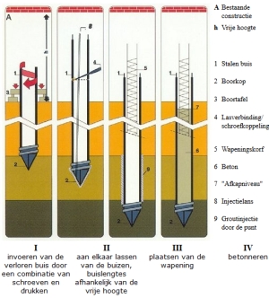 zie de tekeningen onder). Dit is een soort buisschroefpaal, maar even iets anders. Tijdens het draaiproces wordt een mengsel van water en cement (=
