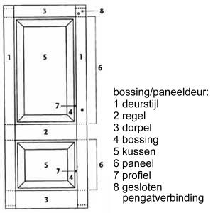 paneeldeur met 1=deurstijl, 2=regel (ook: schei, middenregel, soms zelfs middendorpel), 3=dorpel (bovendorpel, onderdorpel; bovenregel, onderregel), 4=bossing, 5=kussen, 6=paneel, 7=profiel, 8=gesloten pengatverbinding (stichting monument & materiaal): ![]() |