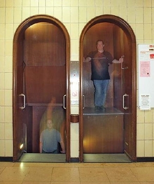 Hoewel het één lift is, zijn er voor de gebruiker er altijd twee "liften": bijvoorbeeld