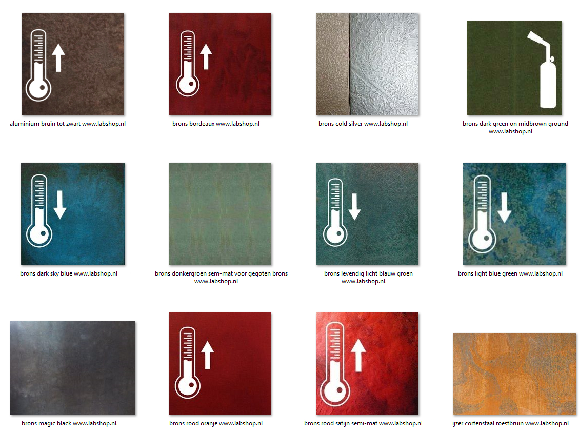 Bijvoorbeeld De Bronsgieterij maakt gebruik van verschillende van de onderstaande methodes van patineren: