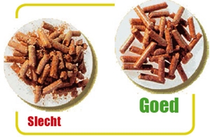 - Kwaliteit van de pellets. De Duitse Industrienorm DIN garandeert een goede pellet. Controle: een goede pellet zinkt in water (dichtheid > 1,1) en is compact (valt niet snel uiteen). Niet alle merken pellets voldoen (volledig) aan de DIN.
