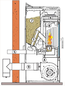 De onderdelen van een pelletkachel: 1. aanvoervijzel 2. gloeistaaf 3. branderbakje 4. rookfilter 5. aanvoer van verse lucht 6. roestvrijstalen warmte wisselaar 7. pellettank 8. terugslagplaat 9. rookafvoer |