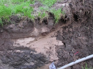 pakket van klei dat op een dijkvoet van zand ligt. Door de hoge waterdruk gaat