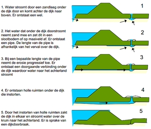 meeneemt en daarmee de dijk verzwakt. Het water stroomt dus "onder de dijk