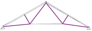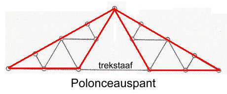 klik op de afbeeldingen voor groter het polonceau-spant bestaat uit twee onderspannen balken (paars aangegeven) waarbij de "toppunten" door een trekstang met elkaar zijn verbonden; de korte stangen in de driehoeken zijn op druk belast: ![]()