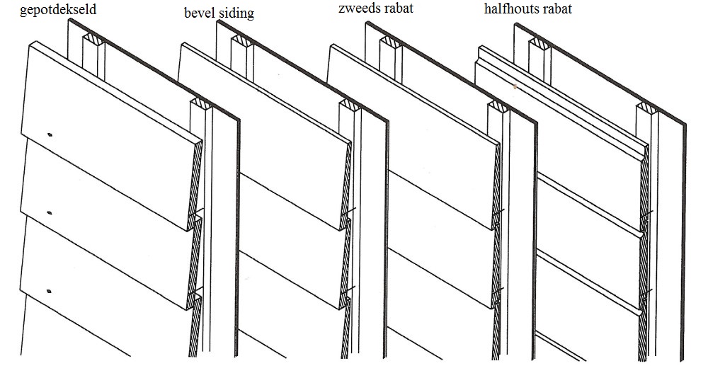 - een variant is bevel siding, waarbij de plank in dikte naar boven afneemt