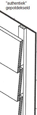 methoden die lijken op potdekselen (centrum hout); zweeds rabat (geen potdekselen: mét sponning) en halfhouts rabat (geen potdekselen: mét sponning, zónder schuinstand) grappig is dat de halfhouts rabat in het engels vaak "dutch lap siding" wordt genoemd ("hollands potdekselen", alleen heeft dutch hier de betekenis: niet echt, zoals in "dutch gold", namaakgoud, of "dutch concert", een opstootje / geluidsoverlast): ![]() ![]() |