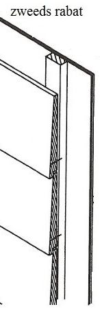 - Zweeds rabat heeft het uiterlijk van potdekselen (maar wordt niet zo benoemd?): elke plank neemt in dikte naar boven af én de overlap van de planken heeft bij de bovenliggende plank een inkeping/sponning, waar dat dunnere deel van de onderliggende plank in past en waardoor het uiterlijk minder log wordt. Voordeel van Zweeds rabat is dat de planken door de sponning goed in elkaar passen en dat er geen opening is tussen plank en stijl (beide met gevolg dat er een betere afdichting is).
