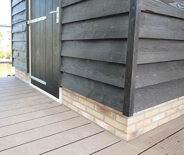 Om te vermijden dat de onderste planken van een gepotdekselde gevel vuil worden en sneller gaan rotten door opspattend hemelwater wordt ook wel dat onderste deel van de gevel in metselwerk uitgevoerd (dus pas potdekselen vanaf 40-50 cm hoogte, boven peil). Het geheel geeft ook een wat stabiele indruk met zo'n plint / borstwering / trasraam. Houd er wel rekening mee dat bij toepassing van zo'n metselwerk onderaan de gevel: