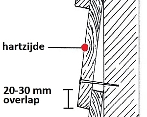 - De hartkant van de plank moet naar buiten gericht zijn, zodat bij kromtrekken geen kieren geeft tussen de planken; bovendien is de hartkant duurzamer.
