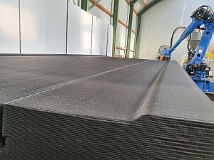voetgangers/fietsbrug in kunststof voor de gemeente alphen aan den rijn, vervaardigd uit gerecycled kunststof (granulaat) en zelf later weer te recyclen (een "circulaire brug"); de foto toont het printen; klik voor groter (10xl): ![]() |