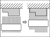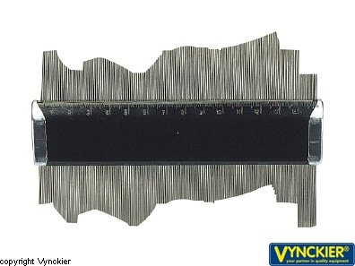 Methode, voorbeeld met de deurpost: schuif alle naalden van de mal uit (linker deel van de eerste afbeelding hieronder), duw de mal tegen de deurpost en laat de naalden de vorm zo strak mogelijk volgen; teken de vorm af op het materiaal dat u wilt uitzagen.