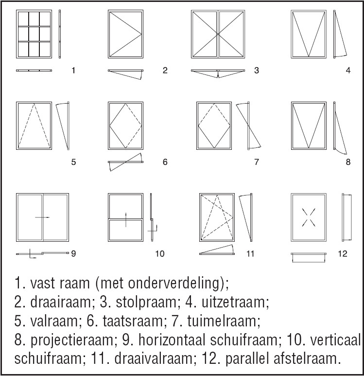- naar binnen draaiende en naar buiten draaiende ramen; hoewel er