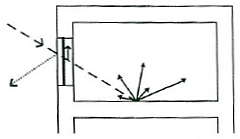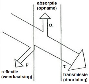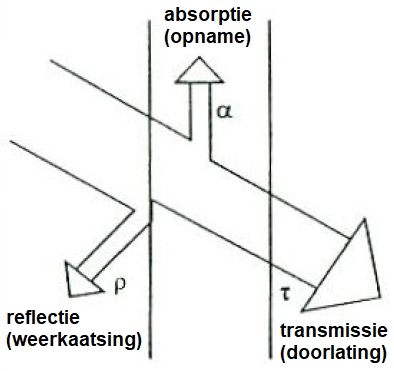licht op/in/door een glasplaat splits zich in reflectie ρ, absorptie α en transmissie τ (klimapedia): ![]() |
