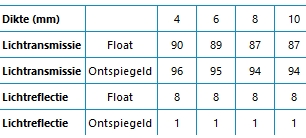 Verg. spiegel, g-waarde, LTA-waarde (lichttoetredingsfactor) en eventueel Ultraviolet Protection Factor UPF.