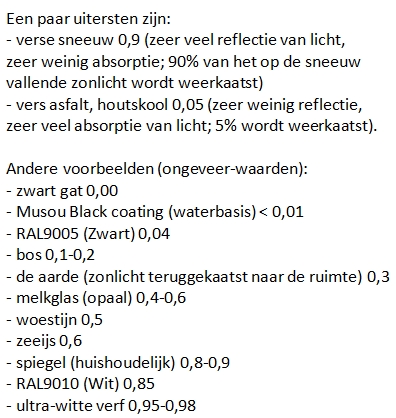 - vers asfalt, houtskool 0,05 (zeer weinig reflectie, zeer veel absorptie van licht; 5% wordt weerkaatst).