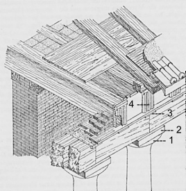 locatie van de regula (3) bij een vroege tempel met dorische zuilen (vitruvius, aangepast): ![]() |