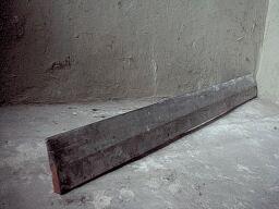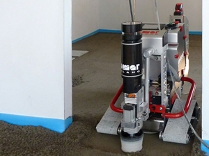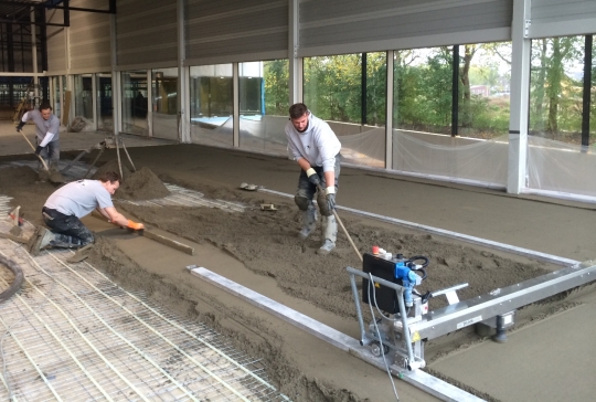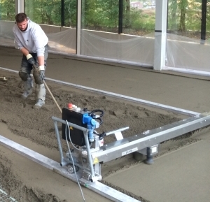 toepassing van de mechanische reilat, die zich op wieltjes voortbeweegt over twee rails en de materie (bijvoorbeeld zandcement) meteen gladstrijkt; klik voor groter (nicky huisman complete vloerverzorging): ![]() |