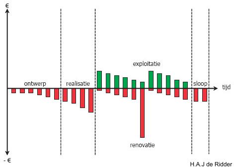 kosten en opbrengsten van een gebouw in de tijd; de kosten en opbrengsten van een bouwwerk verschillen in de tijd: ontwerp, realisatie, exploitatie, renovatie, exploitatie, sloop); klik voor groter: ![]() |