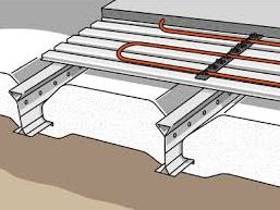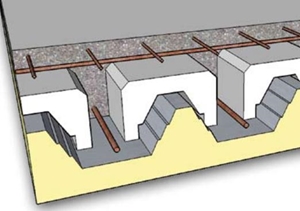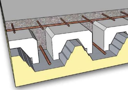 - Wapeningststaal tussen de EPS-profielblokken en een wapeningsnet om een gewapend betonnen vloer te verkrijgen.