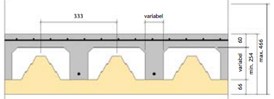 - Naar keuze droog systeem (d.w.z. er wordt geen beton gestort en geen zandcement afwerkvloer) of nat systeem (d.w.z. een gewapend betonnen vloerlaag over de liggers en polystyreen vulelementen).