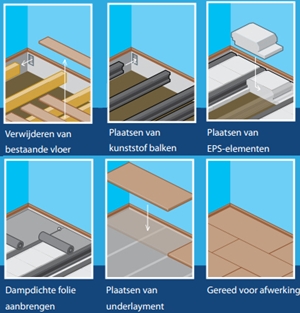 - Droog systeem, d.w.z. er wordt geen beton gestort en geen zandcement afwerkvloer.